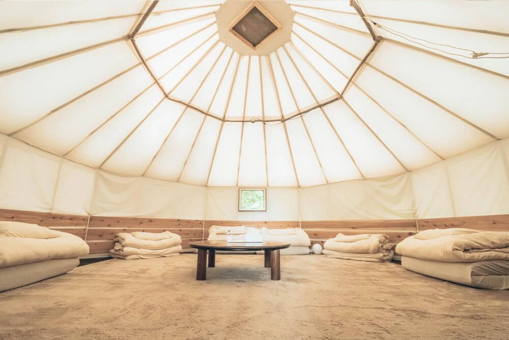 「RetreatCamp まほろば」には、テントサイトやオートサイトの他にトレーラーハウスやスモールハウスなどもあります。極めつけはキャンプ場の最上段に設置された「パオテント」。パオテントとはモンゴル地方でよく見られる円柱型のテントの事で、内部は広くゆったりとくつろげます。