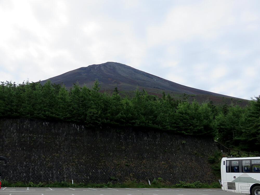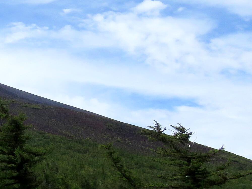富士山五合目駐車場が近づくと富士山山頂が目に入ってきます。五合目付近から眺める富士山頂は、比較的近くに感じますが、通常五合目から山頂までは徒歩で6時間ほどかかります。五合目はちょうど立木が生育できず森林を形成できない「森林限界線」に位置しているので森林と溶岩・岩石地帯の境界線を見ることができます。