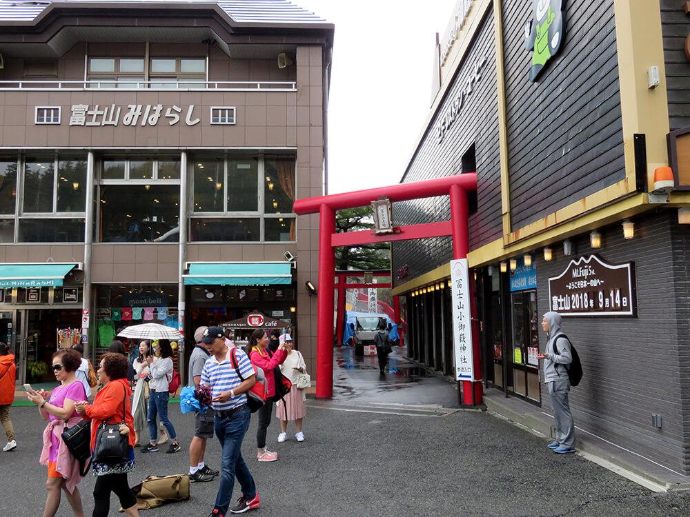 富士山五合目の売店が立ち並ぶ脇に赤い鳥居が立っています。この鳥居をくぐり奥へ進むと承平7年(937年)に磐長姫命(いわながひめのみこと)が祀られた「富士山小御嶽神社」があります。富士登山前にはぜひお参りしましょう。実はこの神社の本殿の奥には展望台があります。ここからは晴れていれば富士吉田市の街や山中湖や河口湖、そして日本アルプスまで一望できるおすすめのスポットです。
