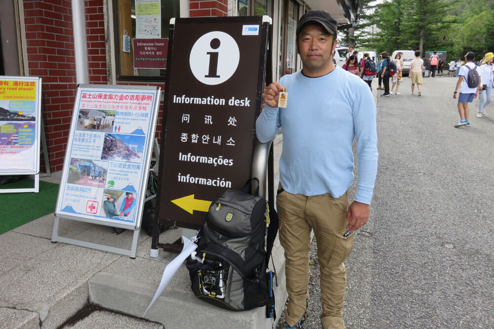 登山前最後に富士スバルライン五合目総合管理センターで「富士山保全協力金」1,000円を支払い、そのしるしとして木札をもらい、いよいよ登山スタートです。