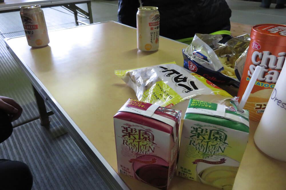 夕飯までの時間は下界のコンビニで購入した、パックワイン2パックをバタピーをつまみにおいしくいただきました。