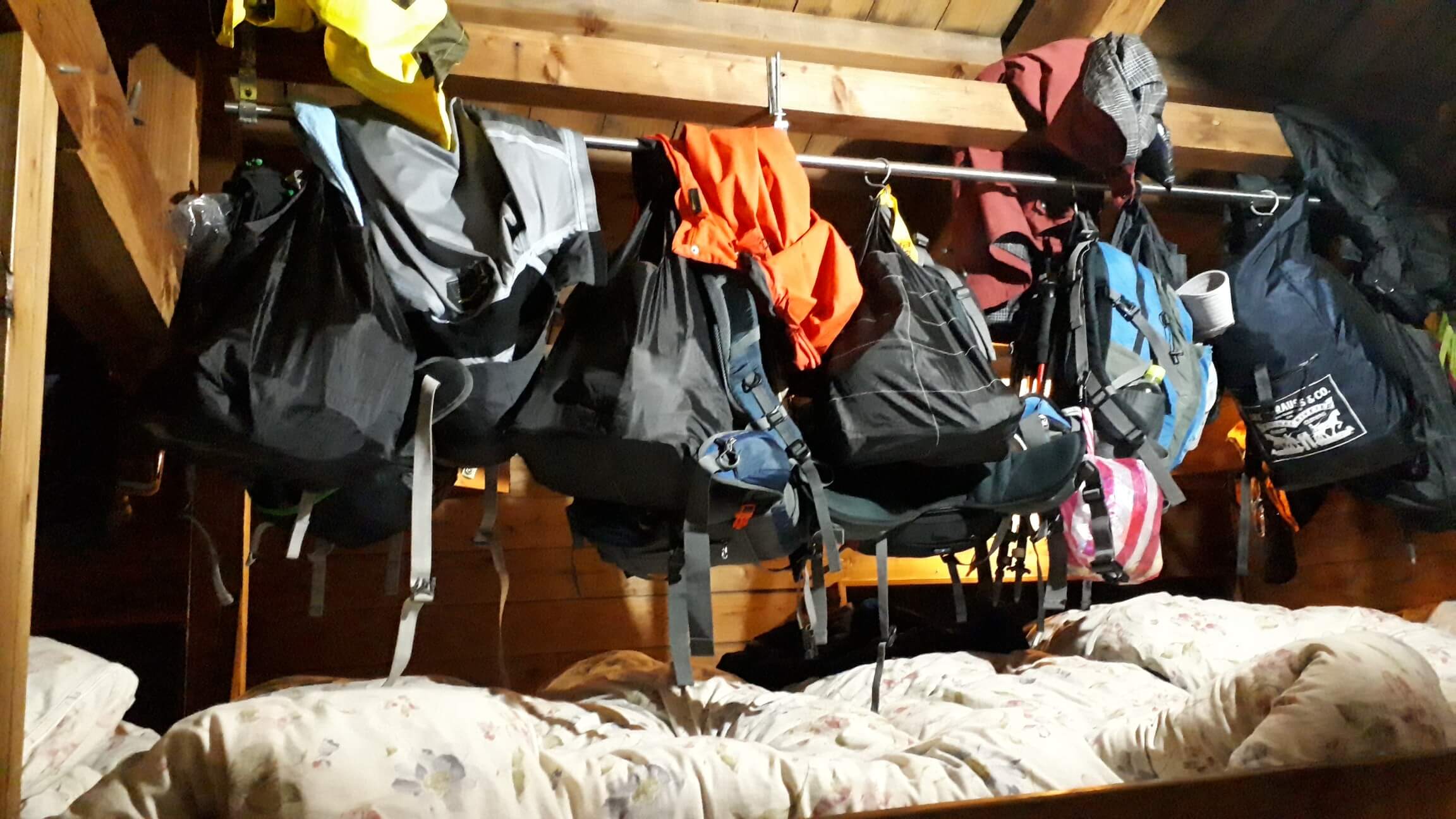 写真は寝床の様子です。それぞれの頭上に設置してあるポールのフックに荷物を掛けておきます。山小屋で多くの方に利用してもらうためのスペース確保術です。