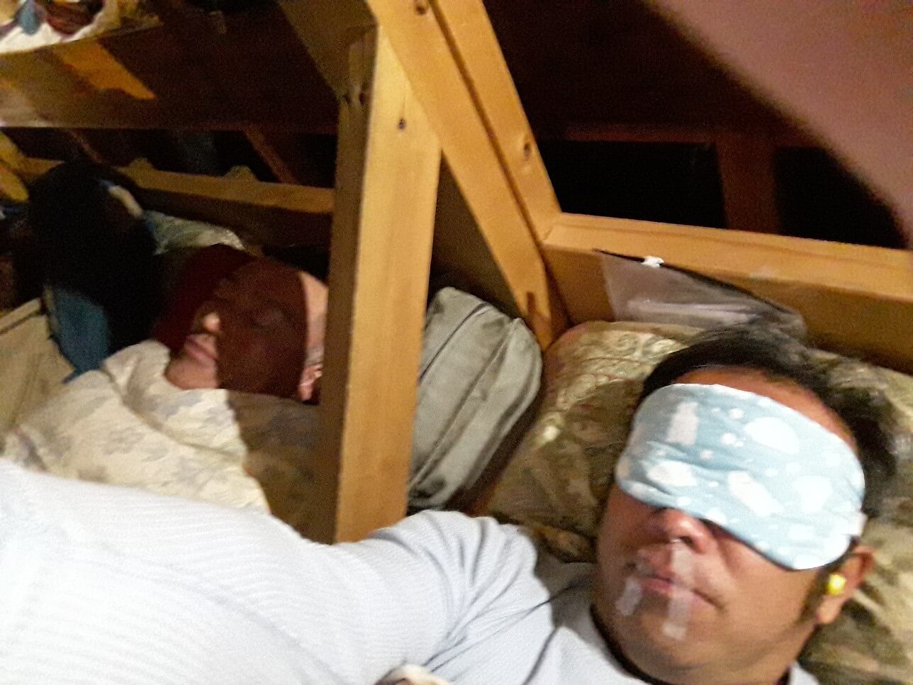 翌日の予定(4:00起床、5:00にご来光を拝んでから、山頂を目指す)寝るための装備品には、アイマスク・耳栓・口テープの3点を装着し、準備万端です。汗や雨での服装の濡れもなかったので、登山のままの服装で寝ますが、唯一靴下だけは脱いで寝ました。