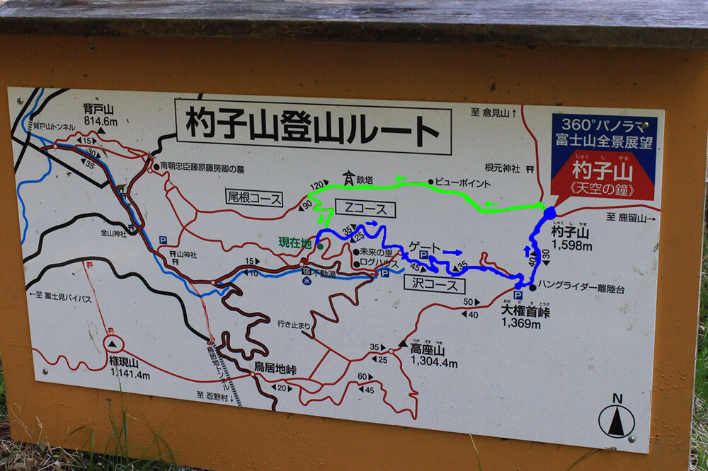 「杓子山」へは都留、忍野、富士吉田から登る登山ルートがあり、それぞれで登山の難易度が違ってきます。今回記事で紹介するルートは富士吉田の明見地区から登る登山ルートです。