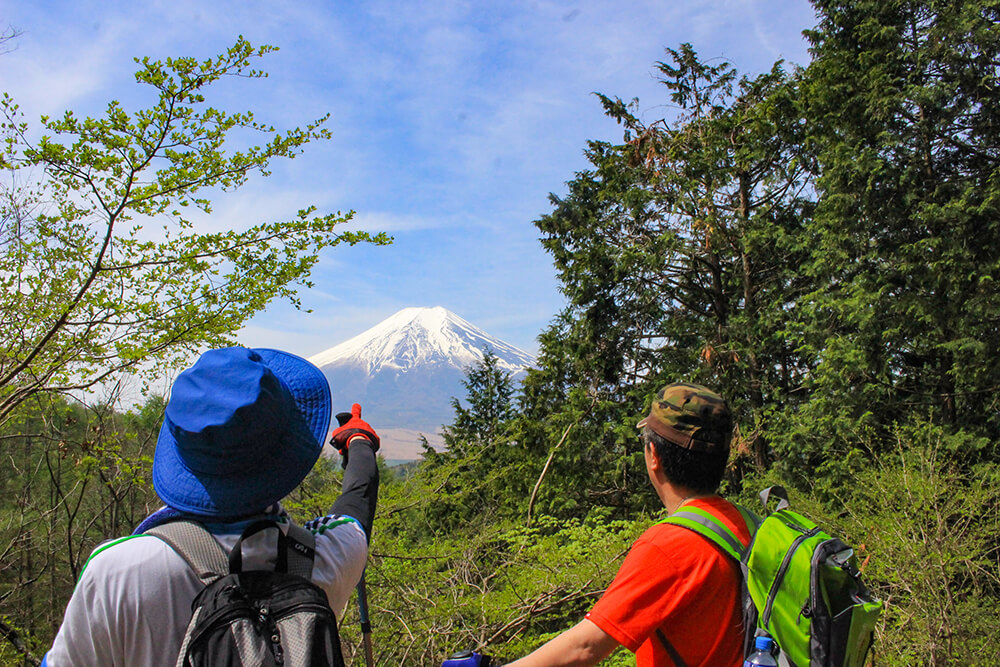 時折木々の間から顔を覗かせる富士山を眺めながら、景色を楽しみつつ登ってみてください。富士山をバックに記念写真を撮りながら登るのもおすすめです!