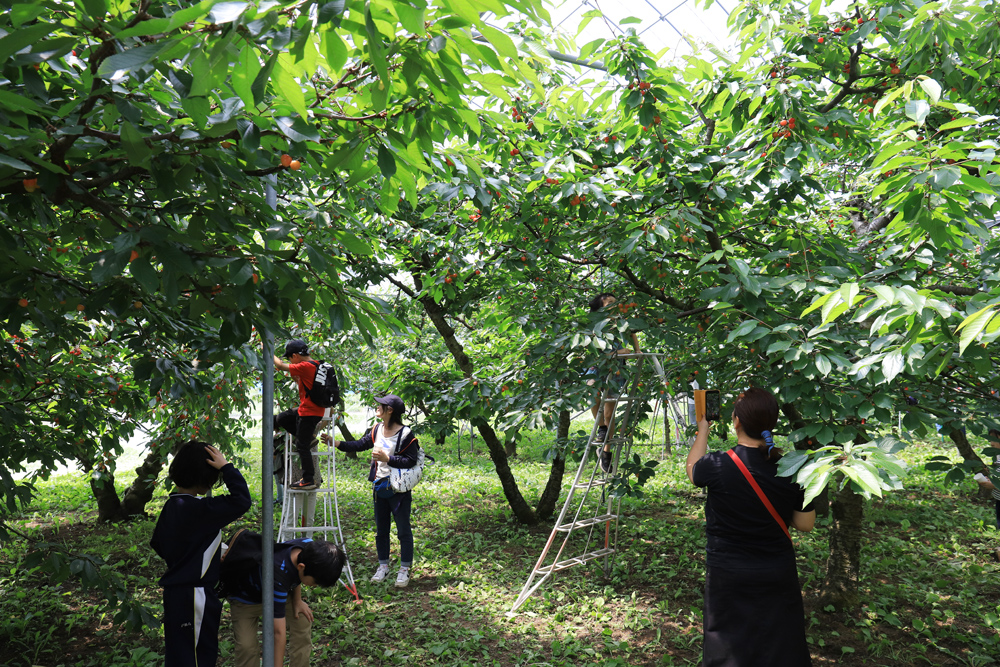 さくらんぼ狩りは富士河口湖町の大石地区、河口湖サクランボ生産組合の農園で行っています。