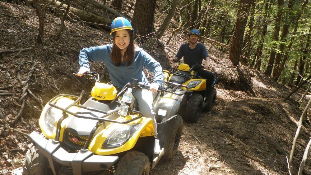 河口湖湖畔の自然の中で木々の間を縫うように走る4輪バギー(ATV)が体験できます。コースはスリルのあるオフロードですが、基本技術の練習や、インストラクターがコースへ同行してくれるため、安心して楽しむことができます。16歳以上が対象です。