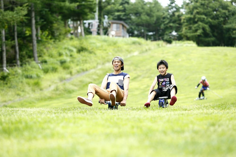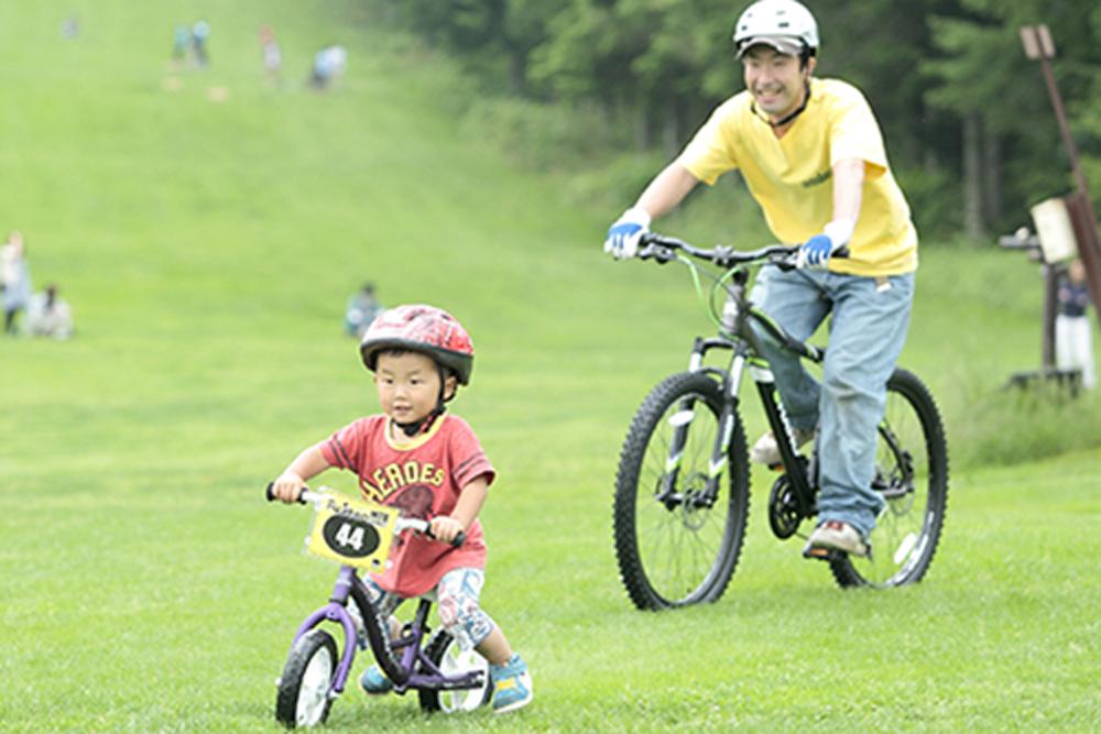 サマースキーに使われる芝生のゲレンデでランニングバイクに乗れるので、大人がしっかりと付き添えば、小さなお子様でも楽しく体験できます。