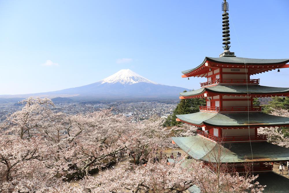 とくに桜の季節には、園内の約650本の桜が一斉に咲き誇り、桜と五重塔と富士山という日本らしい景色が楽しめます。