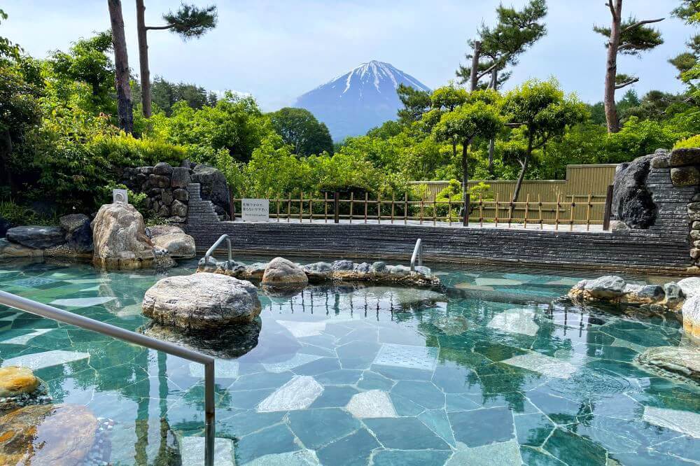 赤池があるCAMP AKAIKEから車で10分ほどの場所にある日帰り温泉「富士眺望の湯ゆらり」。富士山が見える2つの絶景露天風呂のほか、溶岩風呂、香り風呂など内風呂もバラエティ豊かで、キャンプや富士五湖観光の帰りに立ち寄りたい温泉施設です。