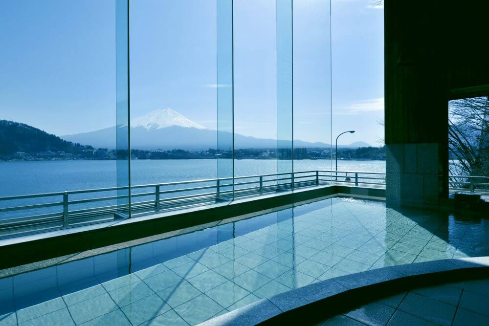 河口湖の湖畔近くにある「富士ビューホテル」は、その名の通り富士山を一望できる美しいホテルです。富士山ビューに特化したバルコニーと展望風呂付きの客室もあり、部屋でくつろぎながら富士山の眺望を楽しみたい方におすすめです。