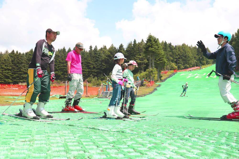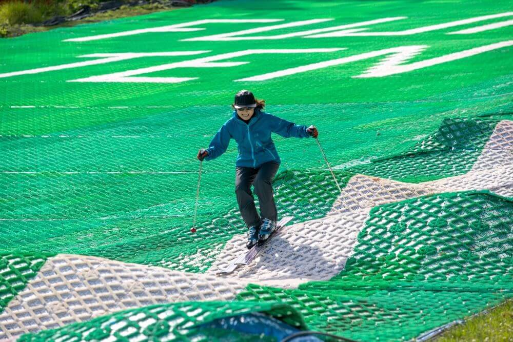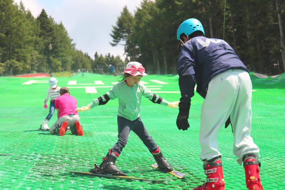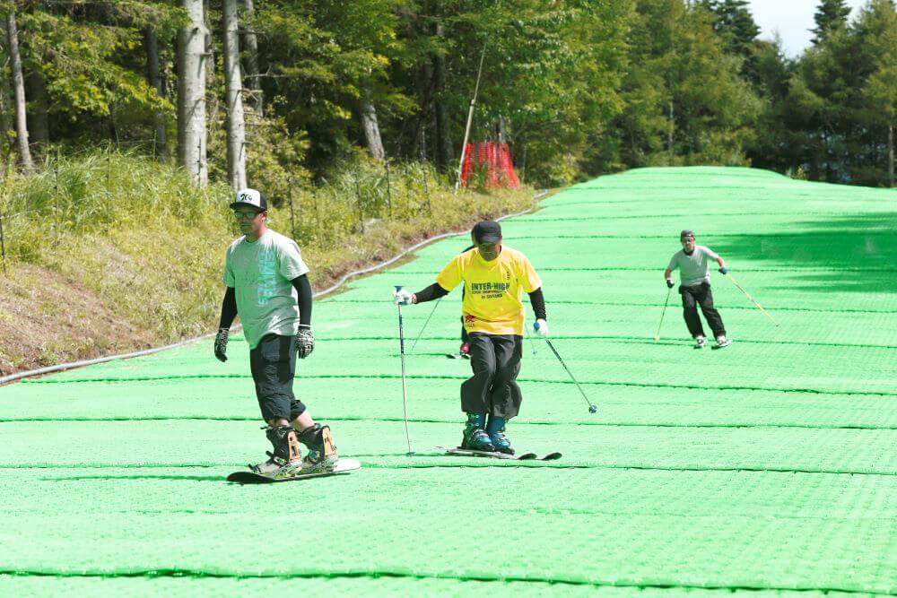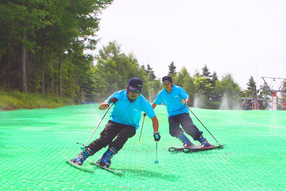 サマーゲレンデは滑走性に優れた「カービングマット」という人工のマットの上を、スキー板やスノーボードを着用して雪上とよく似た感覚で滑ることができる「夏用のスキーゲレンデ」です。マットはスキーのエッジがグリップしやすいように素材の硬さやピンの長さが調整されており、カービングターンの練習におすすめです。