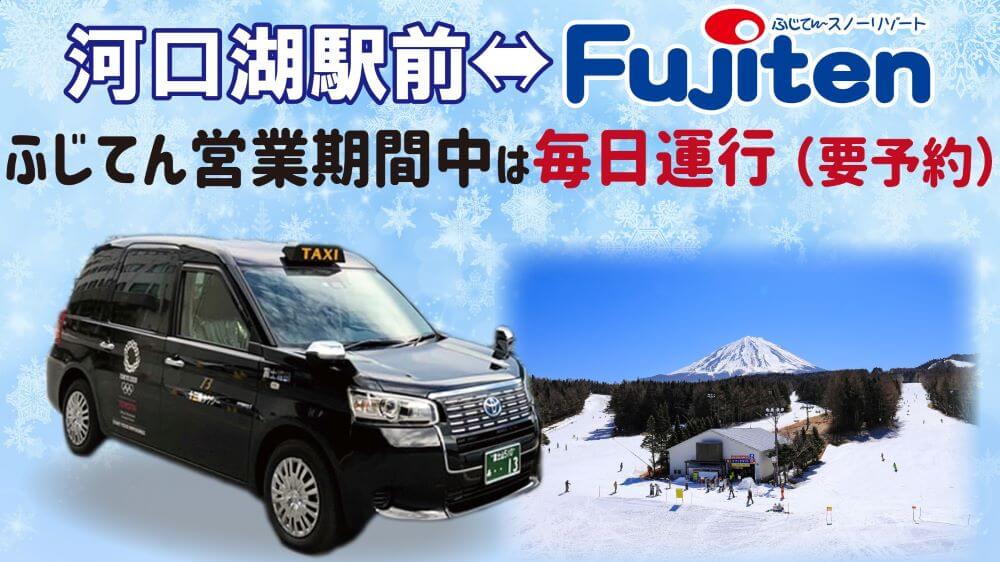 電車を使う場合は、富士急行線河口湖駅からタクシーでの移動となります。富士観光トラベルの「スキータクシー」を利用すれば、出発時間・帰着時間自由で河口湖駅-ふじてん間を往復できますよ。リフト券もお得に購入できるお得なサービスまでついていますので、電車で来場する際は要チェックです。