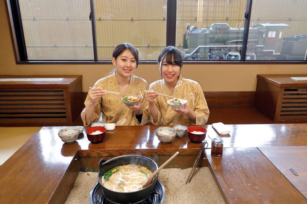 お風呂を堪能したあとは食事を楽しみましょう。富士眺望の湯ゆらりには「ふじざくら」と「お狩場」2つのお食事処がありますが、なかでも個室で食事を楽しめるお狩場は周りを気にすることなくゆっくり過ごすことができるのでおすすめです。山梨の郷土料理「ほうとう鍋」をいただけますよ。