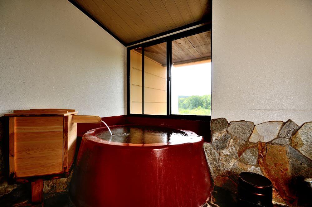 また、隣接する宿泊施設「富士緑の休暇村」に宿泊すれば、貸切風呂を利用することができます。桧風呂やかまど風呂、炭風呂などユニークなお風呂ばかりで、内風呂ですが窓から富士山を眺めることができます。家族でのプライベートな利用にピッタリです。