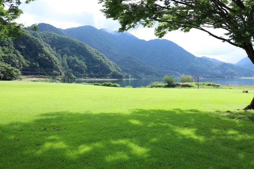 道の駅かつやまの道向かいには、小海公園の芝生広場が広がっています。奥河口湖を一望できる唯一の場所で、休日には多くの人々で賑わう人気の公園です。道の駅に車を停めて、河口湖畔の遊歩道をのんびりと散歩したり、涼しい湖畔の水辺で旅の疲れを癒すこともできますよ。