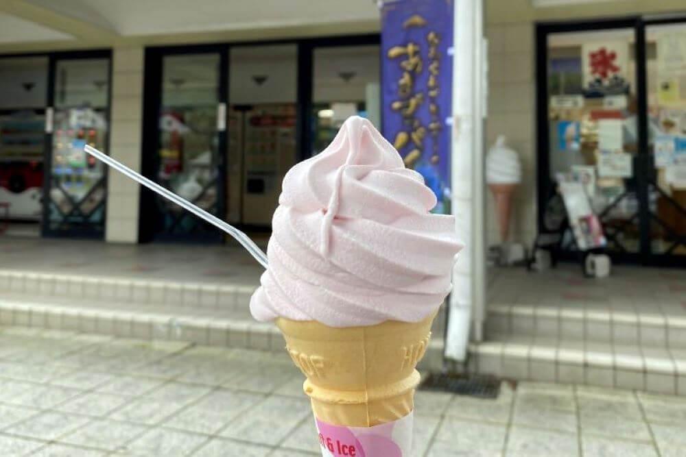 道の駅なるさわの軽食堂では、ここでしか味わうことができない絶品スイーツ「富士桜ソフトクリーム」をいただくことができます。富士山の麓に自生するフジザクラの実から作られたシロップを使用しており、ほんのりピンク色ですっきりとした甘さが特徴のソフトクリームです。