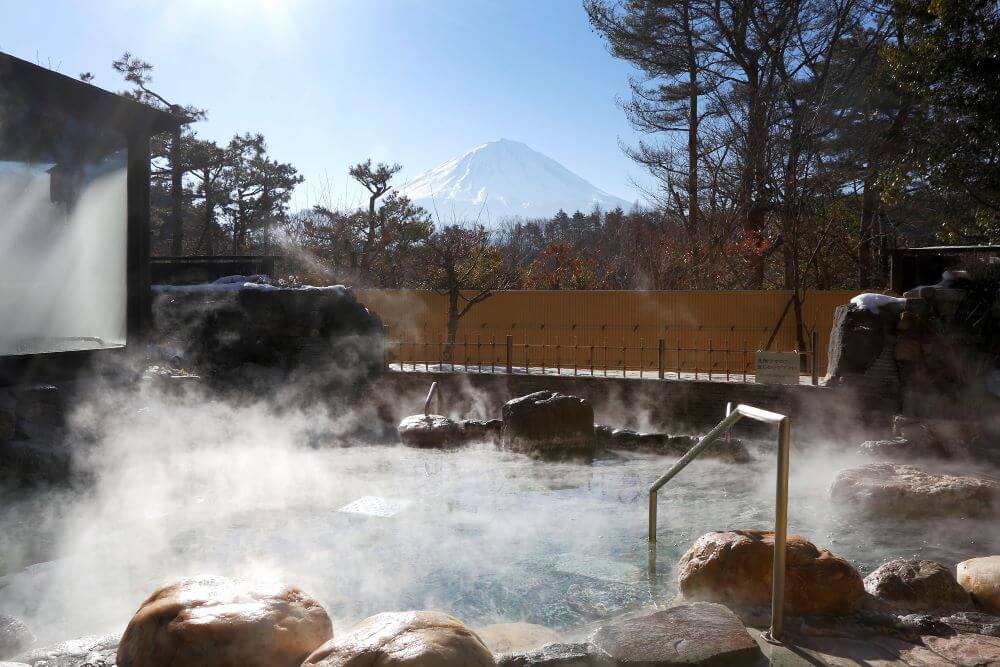 鳴沢村にある日帰り温泉「富士眺望の湯ゆらり」では、バラエティ豊かな16種類の温泉を楽しむことができます。「霊峰露天風呂」と「パノラマ風呂」は富士山を一望できる絶好のロケーション。冷えた体を温めながら、絶景を満喫しましょう。館内の食事処お狩場は個室になっていてゆったりと食事を楽しむことができます。料理はミニSLが運んできてくれるので、子どもたちも大喜びです。