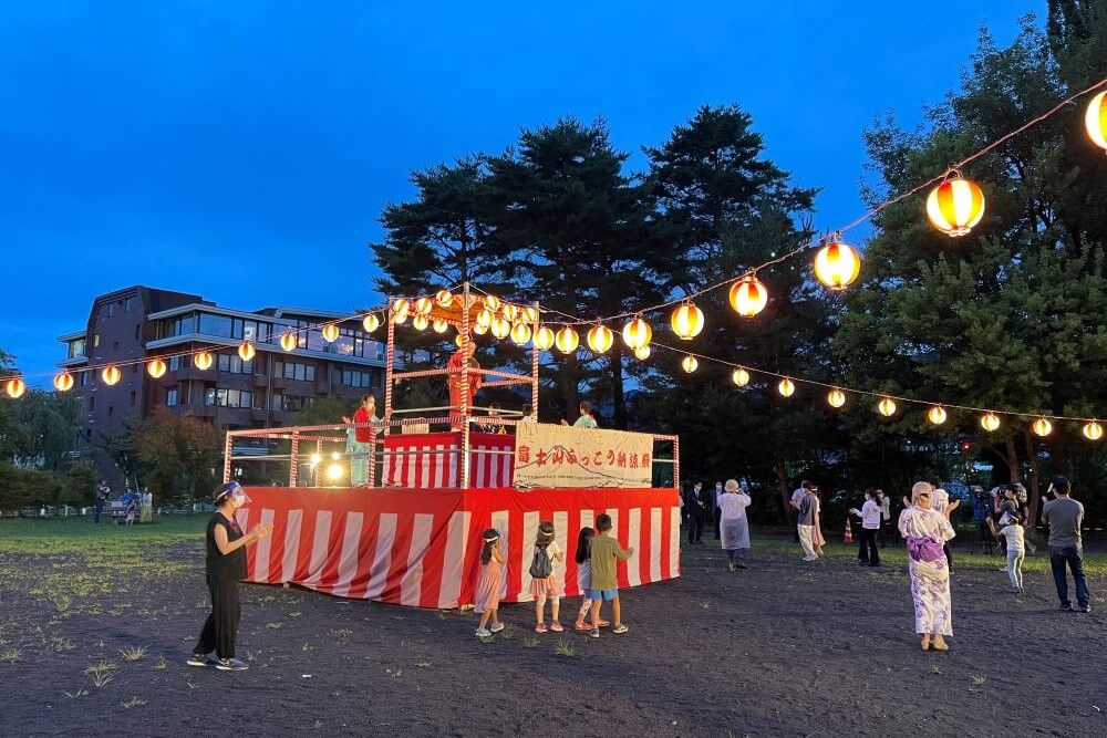 会場となる河口湖の大池公園には出店などが立ち並び、昔懐かしい村祭りのような雰囲気が楽しめます。2021年には盆踊りや地元の人気シンガーによるミニライブも開催され盛り上がりました。