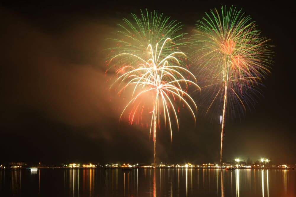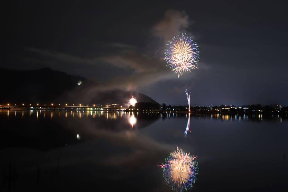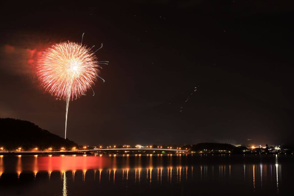 晴れていれば富士山をバックに花火鑑賞ができます。大池公園の対岸にある産屋ヶ崎からは夜空に広がる大輪の花火が湖に映る様を見ることができ、まさに圧巻の一言です。