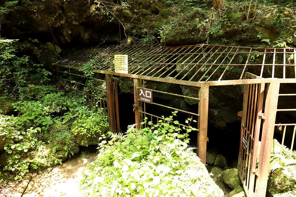 まず、涼を求めて向かった先は、西湖の西側にある「コウモリ穴」。パンフレットには「他の洞穴と異なり夏でもそれほど冷気を覚えず・・・」と記載されていましたが・・・入口ではまずヘルメットを手渡され、入場ゲートから洞穴へ向かう森の中へ入ります。森へ入っただけでも少し気温が下がった感覚がします。5分程富士の樹海の中を散策すると、コウモリ穴への入り口が見えてきました。