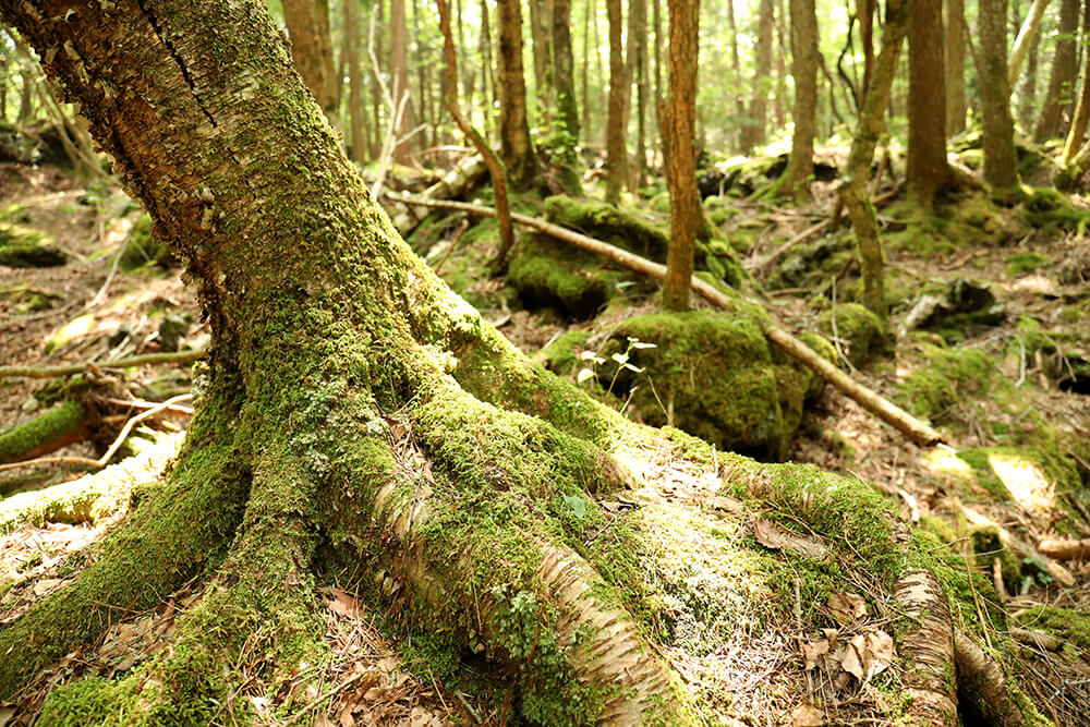 西湖のすぐ近くには青木ヶ原樹海が広がっています。先ほどご紹介した西湖コウモリ穴のある西湖ネイチャーセンター案内所では、青木ヶ原樹海ネイチャーガイドツアー(有料)を実施しており、青木ヶ原樹海の自然を熟知したエキスパートの解説を聞きながら樹海を歩く事ができます。もちろんガイド無しでも散策できますので、今回は晴れていれば富士山の眺望がきれいな「根場浜」までの遊歩道を散策してみましょう。