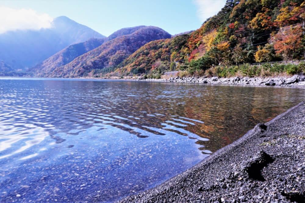 富士五湖で一番深い湖で(水深125m)、本州にある湖のなかでも透明度がもっとも高いといわれています。1000円札の裏面のデザインされている逆さ富士のモデルとしても知られる中ノ倉峠展望代からの眺めは絶景で、とりわけ秋の紅葉は見事。冬はヒメマス釣りのメッカとしても知られています。