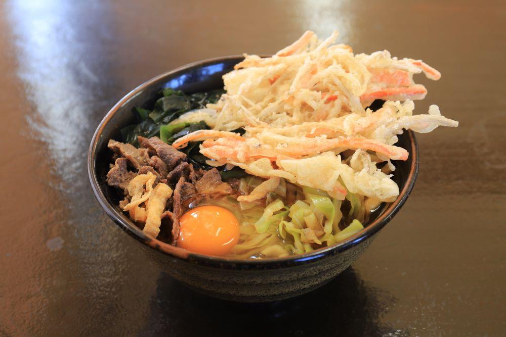 河口湖にある「武骨うどん風林」は30年以上の歴史ある吉田のうどんのお店で、味噌と醤油を合わせた特製スープにコシの強いうどんが良く合います。トッピングも大きなかき揚げをはじめ種類豊富です。