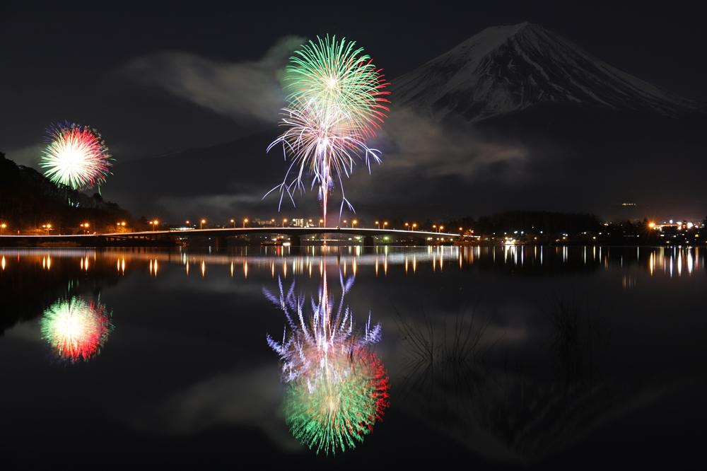 空気が澄んだ冬の夜空に打ちあがる色鮮やかな花火は、富士山周辺の冬の風物詩として毎年多くの人を魅了します。