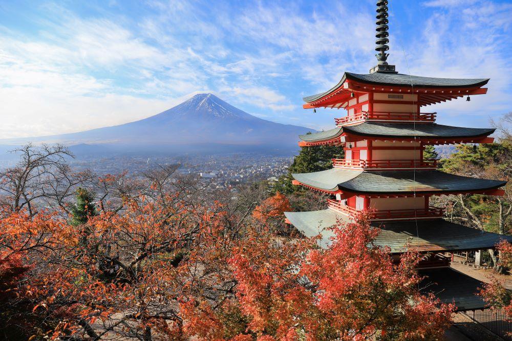 富士山と五重塔と紅葉で秋の風情を感じる