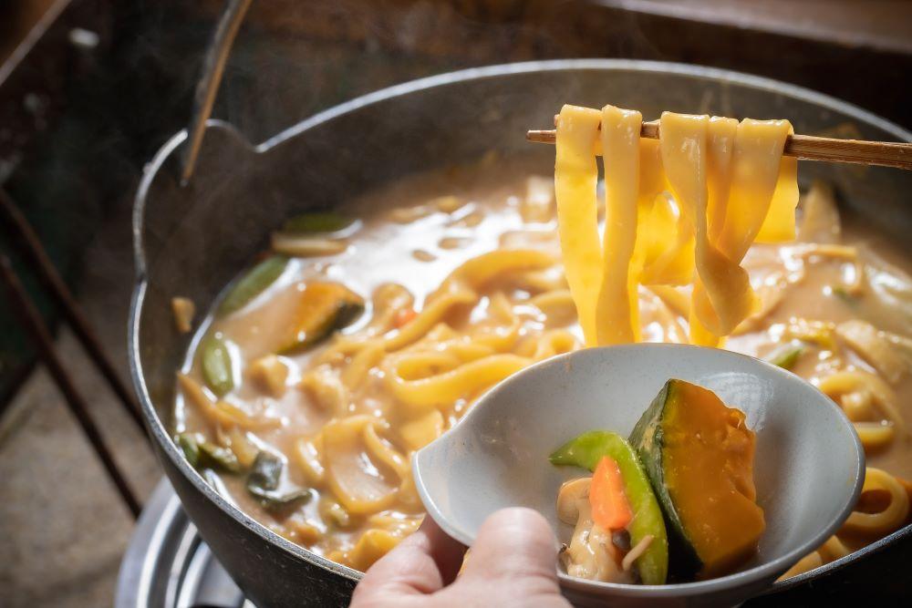 ほうとうは、きしめんのような平麵をたっぷりの野菜やお肉と一緒に味噌で煮込んだ料理です。なかでもカボチャが入ったほうとうがおすすめ。味噌スープにカボチャの甘みが溶け込んで絶品です。寒い冬は温かいほうとうをぜひ食べてみてください。