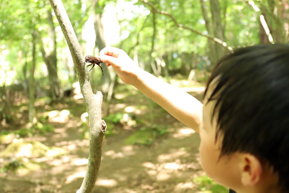 夏休みの大人気イベントで、木の幹や切り株の陰など様々な場所に隠れてるカブトムシを捕まえて虫かごに入れて持ち帰ることができます。