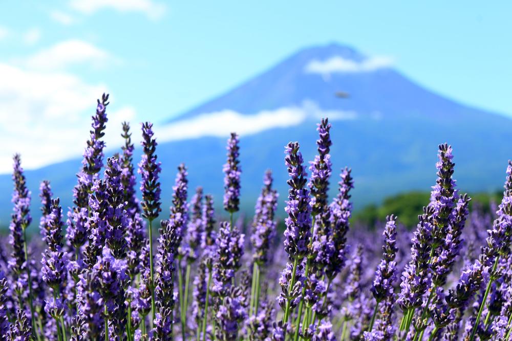 6月下旬~7月中旬、河口湖周辺の約10万株ものラベンダーが見頃を迎えると、富士山の麓を紫の絨毯が彩ります。