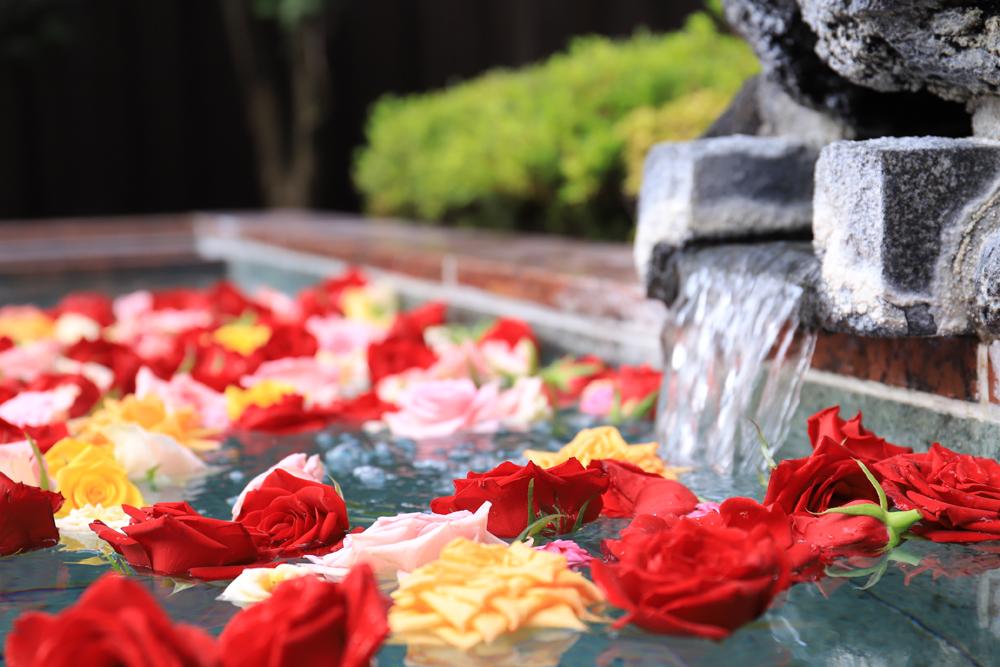 真正面に富士山を眺めながらお風呂を楽しめる露天風呂のひとつ、パノラマ風呂に季節の植物や果物が湯舟に浮かびます。