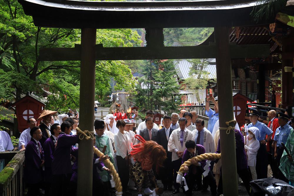 神社に到着した後、吉田口登山道入口の鳥居に張った縄を木槌で断つお道開きが行われ、富士山の開山を告げます。