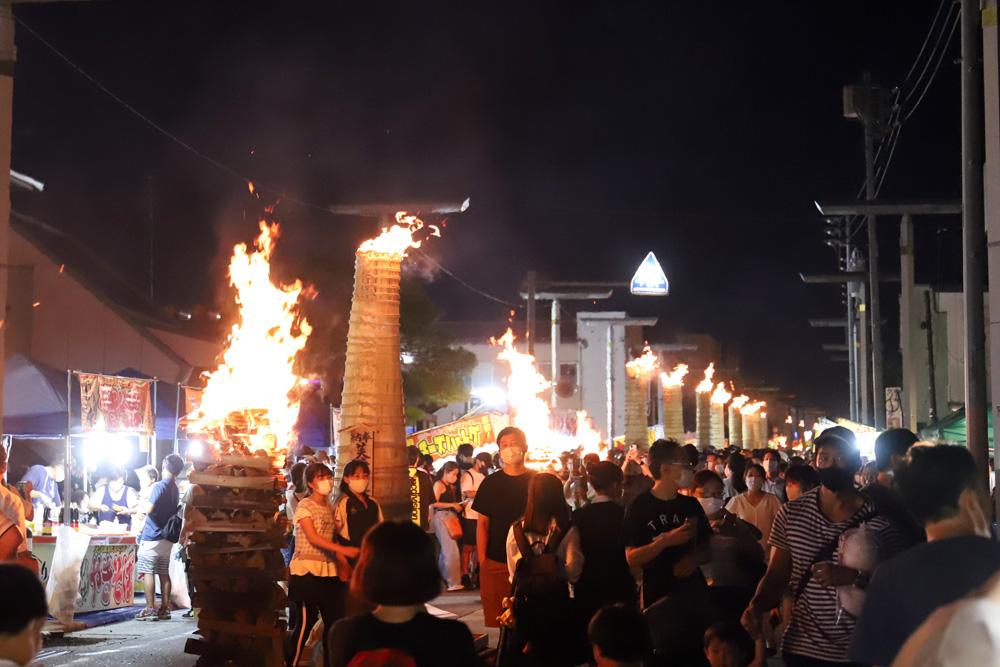 和太鼓の演奏や盆踊りが行われるほか、夕方には会場に設置された数百個の灯篭が点火します。