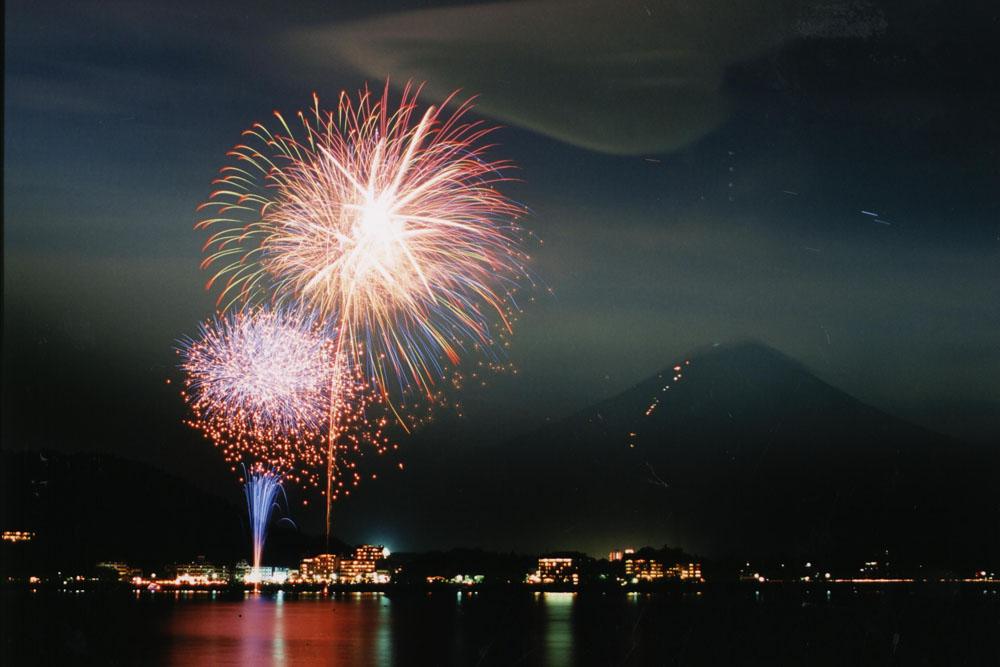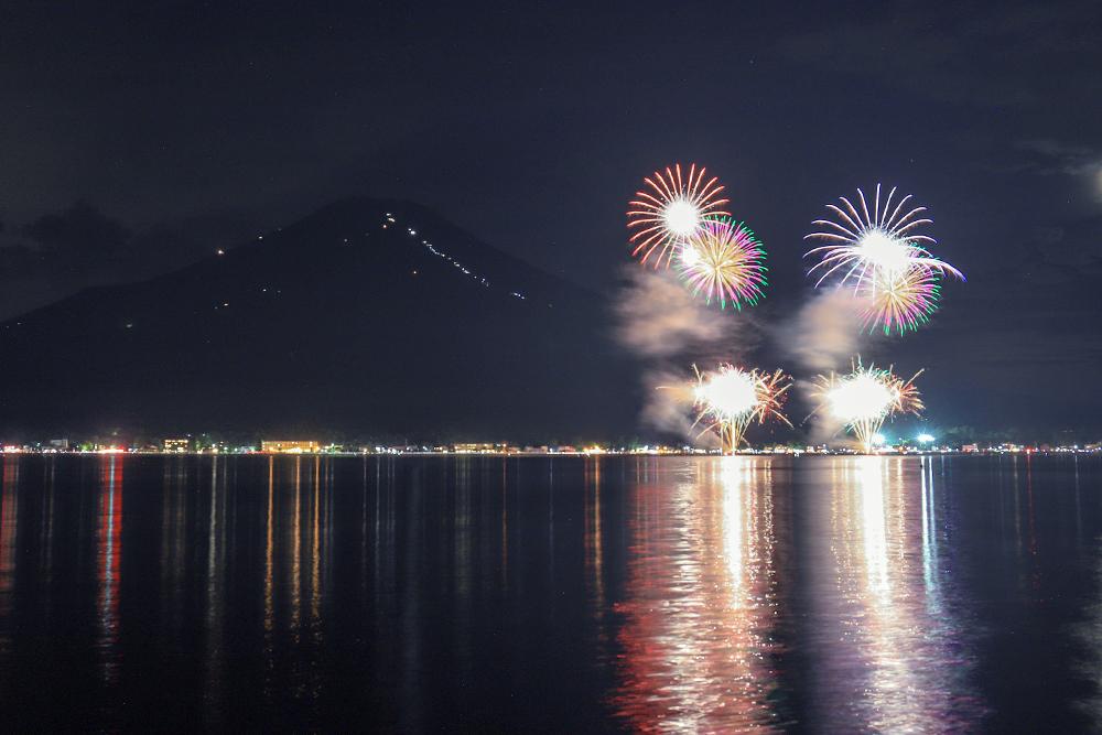 毎年7月の第一土曜日に開催され、富士山の山開きと花火が富士五湖に夏の訪れを告げます。