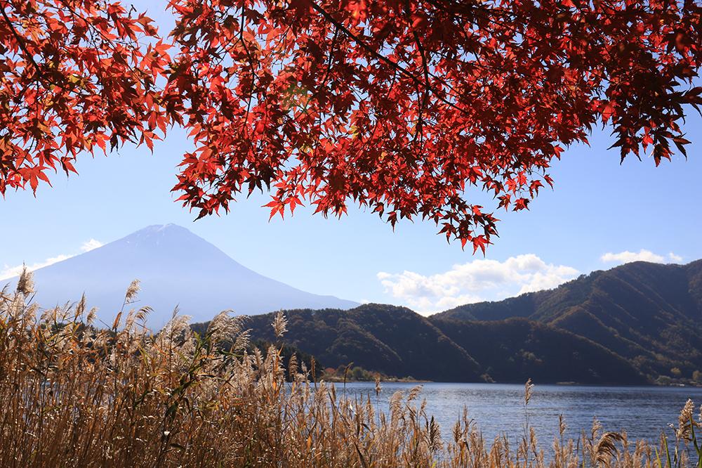河口湖周辺には紅葉スポットがたくさんあり、赤や黄色に染まった木々と富士山のコラボレーションはまさに絶景です。