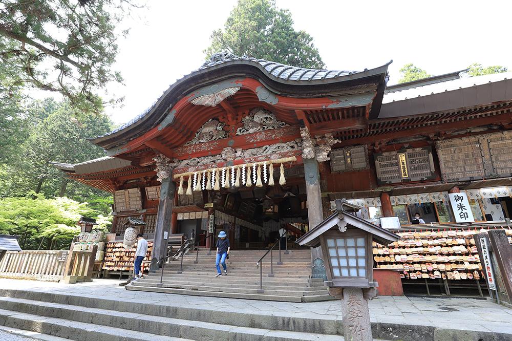 巨大なスギやヒノキが並ぶ参道を進んだ先にある荘厳な本殿は巧みな装飾が数多く施されていて、神々しい雰囲気が漂っています。
