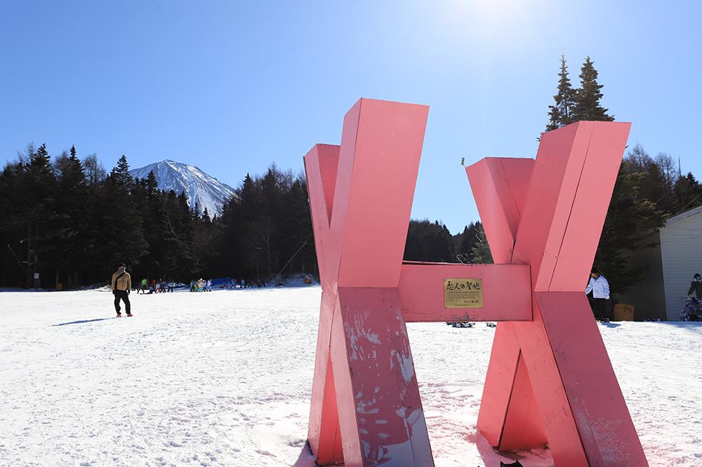 ゲレンデの麓にはピンク色のモニュメントが設置されていて、ここで記念撮影をするカップルも多く見られます。