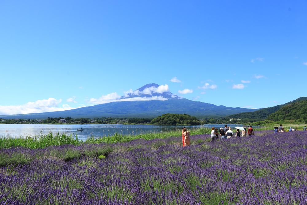 初夏になるとラベンダー畑に花が咲き乱れ、ラベンダー越しに河口湖と富士山を望むことができます。