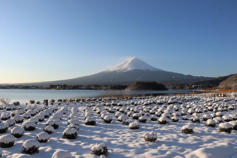 河口湖は冬になると雪が降ります。降雪の時期は主に12月から3月にかけて。本格的に雪が降るのは1月から2月が多いです。この時期に河口湖へ遊びに来るときは事前に天気予報をチェックしておきましょう。もし雪の予報が出ていたらスノーブーツや車のスタッドレスタイヤ装着などが必要になります。