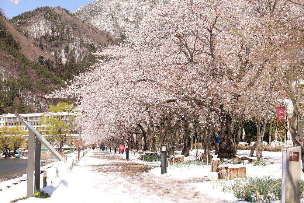 場合によっては4月になってから雪が降ることもあります。上の写真は2020年4月の河口湖畔。桜が見頃を迎えようという時期に雪が降りました。河口湖に住んでいる人は、念のため11月下旬からゴールデンウィーク頃までスタッドレスタイヤを着けていることが多いです。春先に河口湖へ遊びに行くときは雪が降る可能性があることを頭の片隅に置いておくと良いでしょう。