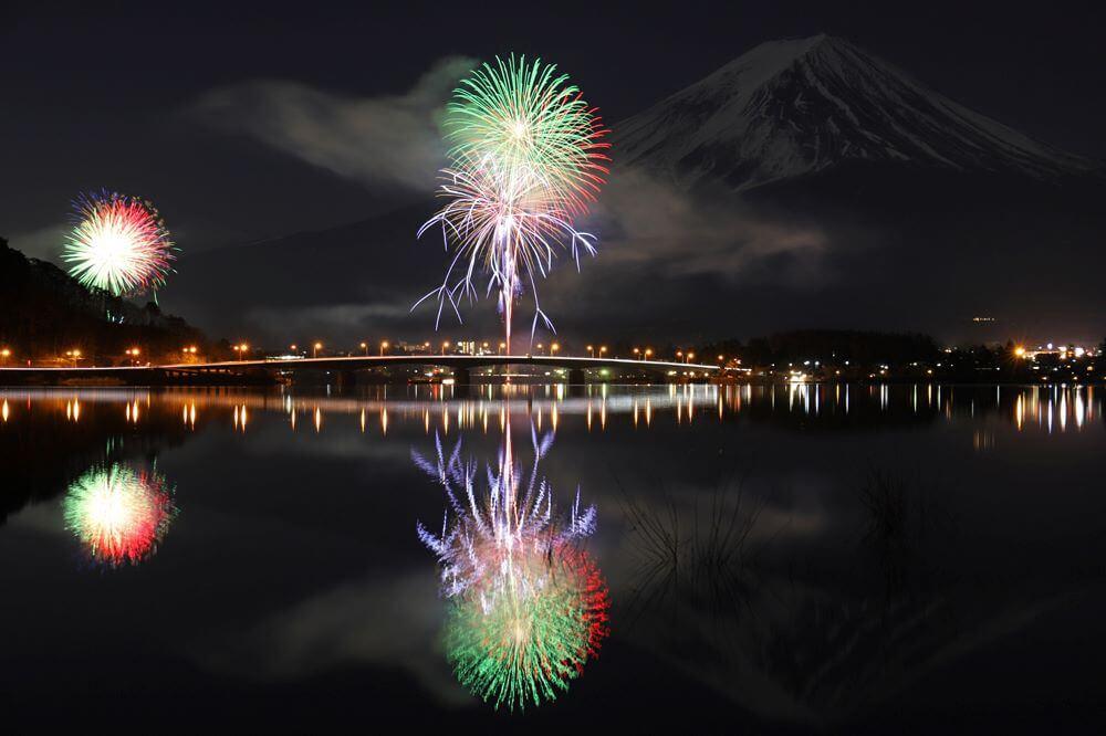 河口湖の冬の風物詩といえば「河口湖冬花火」です。1月中旬から2月中旬にかけて毎週末花火が打ち上げられます。メインの打ち上げ会場は河口湖南岸の大池公園で、大石公園・産屋ヶ崎など河口湖畔各所で花火を鑑賞できます。