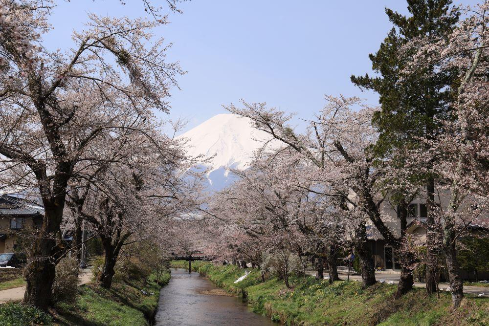 忍野八海は忍野村にある8つの湧水池で、世界遺産富士山の構成資産となっています。桜の名所として有名なのは忍野八海のすぐそばにある新名庄川沿いの桜並木。ソメイヨシノを中心に、フジザクラ、八重桜など約200本もの桜が並びます。