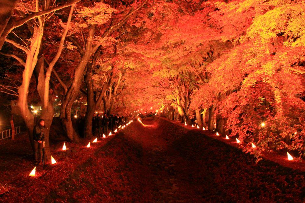 毎年開催される「河口湖紅葉まつり」のメイン会場にもなっており、イベント期間中は夜に回廊のライトアップが実施されます。ライトアップされたモミジは感動モノの美しさですので、ぜひ日没後に訪れてみてください。
