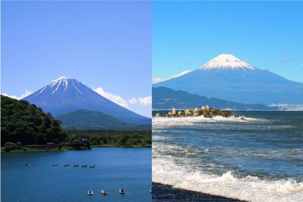 「そもそも山梨と静岡の富士山に違いがあるの?」という方のために、両県からの富士山の見え方について説明します。大きな違いは宝永火口の有無です。富士山の側火山である宝永山の火口は静岡県側からのみ見ることができます。そのため静岡から見た富士山は右側面にボコッと出っ張りがあります。山梨から見た富士山は左右対称で均整のとれた美しさがありますが、アシンメトリーに魅力を感じる方は静岡県側の富士山が気に入るのではないでしょうか。