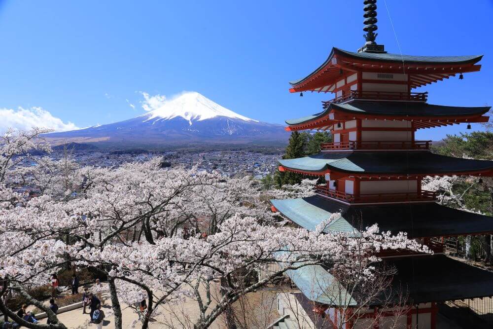 富士吉田市にある「新倉山浅間公園」は外国人にも人気の絶景スポットで、見どころは富士山と五重塔のコラボレーション。日本を象徴するような風景が目の前に広がります。春に訪れるのが特におすすめで、一面に桜が咲き誇り、まるで絵画の中のような美しい景色を見ることができます。