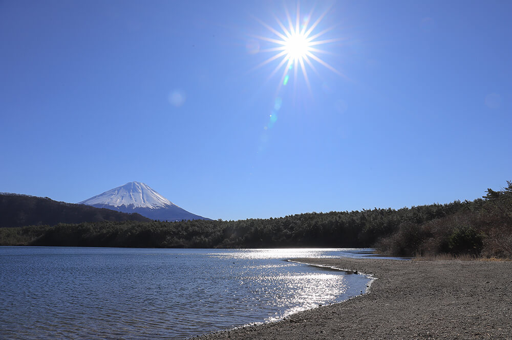 精進湖は富士五湖の中でもっとも小さい湖です。富士五湖から見える富士山は手前に大室山の姿が重なり、まるで富士山が子供の山を抱っこしているように見えることから「子抱き富士」と呼称されます。この子抱き富士は他手合浜やその周辺から見られるほか、1時間ほど山を登り「精進パノラマ台」まで行くと、精進湖とその奥に広がる青木ヶ原樹海まで一望できるため富士山を取り囲む自然の豊かさを感じることができます。周囲の山が鮮やかに色づく紅葉の時期が特におすすめです。