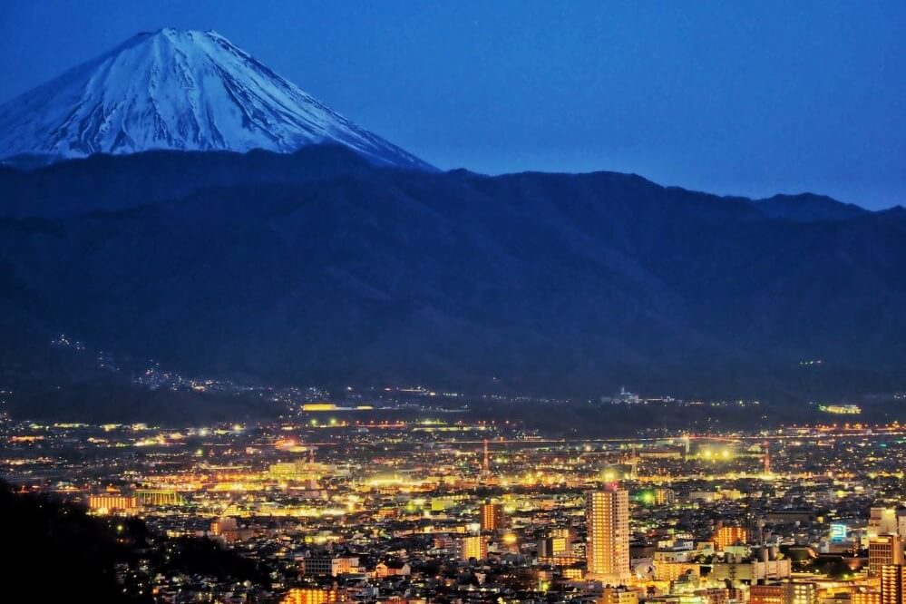 甲府市にある「和田峠みはらし広場」は、甲府駅から千代田湖・昇仙峡へ向かう道中にあります。甲府盆地が一望できる絶好の夜景スポットで、輝く街明かりと、それを見守るように山の向こうから顔を出す富士山はぜひ写真におさめたい美しい景観です。「関東の富士見百景」のひとつにも選定されています。